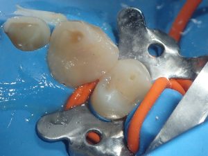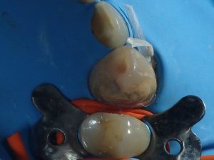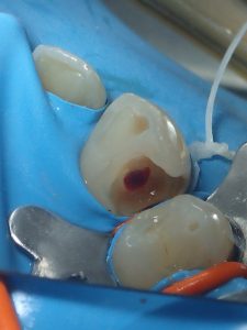 lorsque c’est réalisable ,on tentera de préserver de la vitalité pulpaire!ici c’était pas gagné……….mais…….on a tenté et ça a réussi! la carie est telle qu’elle atteint la pulpe on fait une greffe directement sur la pulpe résultat apres 4 mois :inlay collé pour protéger la biodentine PrécédentSuivant